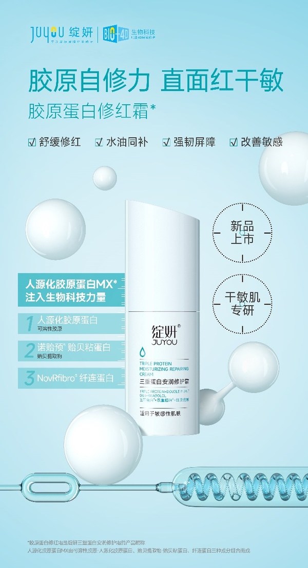 绽妍最新上市的三重蛋白安润修护霜,以"BIO+4D"理论为指导,两大基因工程研发平台专研"NovTripro®人源化胶原蛋白MX"科技配方,模拟人类皮肤屏障成分特点,将人源化"类生长因子"NovRfibro®纤连蛋白和NovRhcol®人源化胶原蛋白进行合成生物学技术重组,并加持绽妍明星成分"生物胶水" — 诺贻预®贻贝粘蛋白。其特有的促愈修护功效,达到对屏障受损皮肤短期缓解长期修护的协同效应。同时,还添加神经酰胺E、红没药醇等成分从外补充"养分"强化4D屏障,内外双面应对因肤质、环境变化、护肤不耐受等引起的肌肤红干敏,修护维稳皮肤屏障。