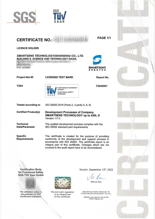 上海2022年11月10日 /新闻稿网 - Xinwengao.com/ — 近日,SGS通标标准技术服务有限公司(以下简称“SGS”)为思特威(上海)电子科技股份有限公司(以下简称“思特威”)颁发ISO 26262:2018流程认证证书,标志着思特威已经按照ISO 26262:2018版标准要求,建立起符合功能安全最高等级“ASIL D”级别的产品开发流程体系,达到国际先进水平。