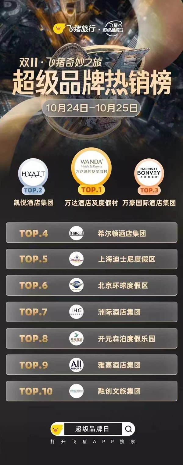北京2022年11月11日 /新闻稿网 - Xinwengao.com/ — 今年11.11大促收官在即,截止发稿之时,万达酒店及度假村11.11大促线上销售额已突破2.2亿元,产品销量近8万份,客房总间夜数超过24万间。其中,万达酒店飞猪旗舰店位居飞猪11.11国内酒店行业热销榜第1名。