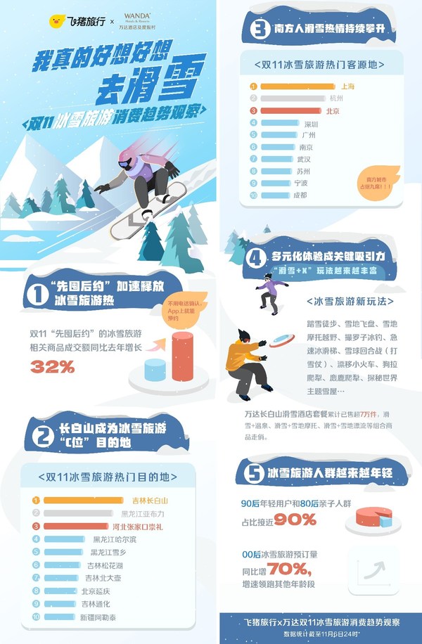 11.11不仅为酒店增收带来了机遇,同时也是品牌传播的契机。11.11期间万达酒店飞猪期间店累计浏览量超过300万,访客近100万,长白山万达国际度假区也成为飞猪11.11最热旅游目的地。同时,万达酒店与飞猪联合发布的《11.11冰雪旅游消费趋势观察》也引起业内外广泛关注,这些举措都使万达酒店及度假村在众多的文旅品牌中脱颖而出,很好地扩大了品牌认知。