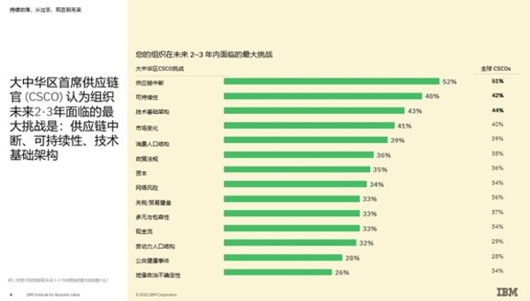 为了更加深入地理解重要供应链组织如何应对持续存在的挑战,IBM 商业价值研究院 (IBV) 针对 35 多个国家/地区和 24 个行业的 1,500 位首席供应链官(CSCO) 和首席运营官(COO)开展了一项调研,其中有 120 位受访者来自大中华区。这项最近发布的研究结果表明,全球有46%的首席供应链官在需求波动以及运输和物流可用性方面遇到了重大问题。仅在过去一年中,将供应链中断视为最大挑战之一的企业的比例就增长了 36%。