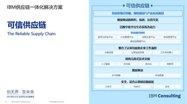 IBM认为这样的转型和重组过程会持续三到五年,针对这样的形势,IBM推出了可信供应链的解决方案,帮助企业实现供应链的智慧转型。这个解决方案是从战略到基础设施的一体化解决方案,其中既包含上层的商业模式思考,供应链细分策略、网络和产能布局的整体规划,组织、绩效、运营文化的打造,涵盖研发、计划、采购、物流等各环节的供应链控制塔的构建,也涵盖混合云等底层基础设施的搭建,人工智能、区块链、自动化、物联网等新技术的运用,以及端到端的智能工作流的打造。