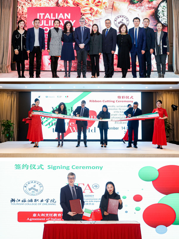 杭州2022年11月21日 /新闻稿网 - Xinwengao.com/ — 11月16日,由意大利驻沪总领馆与意大利对外贸易委员会上海代表处携手举办的"意大利烹饪教育项目"暨意大利烹饪教育工坊,在浙江旅游职业学院圆满落幕。当天,意大利对外贸易委员会上海代表处首席代表迪嘉庆 (Augusto Di Giacinto) 和副代表秦佳 (Cinzia Sarli) 带领的代表团,浙江旅游职业学院副校长王方、浙江旅游职业学院国际教育学院院长黄慧、浙江旅游职业学院厨艺学院院长金晓阳先生、浙江旅游职业学院厨艺学院副院长王玉宝以及青年教师和学生代表出席了此次活动。