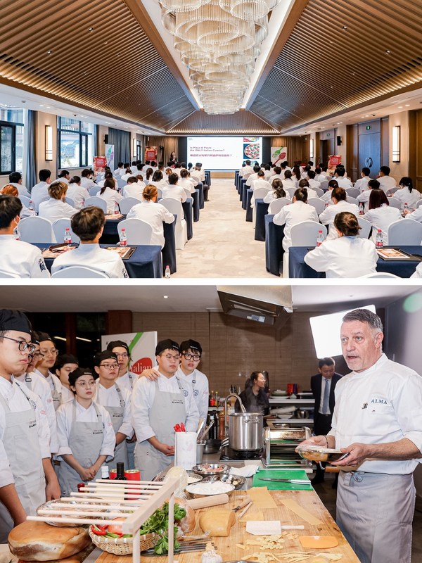 随后,由意大利对外贸易委员会邀请的专业意大利美食讲师,为现场超过100位与会领导、嘉宾与学生等,进行了一系列生动、有趣的课程讲解。除了深入发现意大利料理文化的历史,还多维度认识从北到南的饮食多样性。此前,这些学生已经顺利参加了由意大利对外贸易委员会携手意大利顶级烹饪教育学院尔玛 ALMA,一起为中国院校学生特别制作的关于专业意大利烹饪的教学视频——意大利烹饪教育视频(大师课程),并在考核中获得由意大利对外贸易委员会认证的证书。