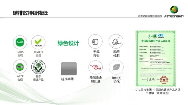 "作为国家级绿色供应链企业,正泰新能在持续提升组件效率的同时,组件产能已实现全部采用大尺寸硅片,积极推广更薄硅片、无氟背板、无铅焊带、脱醇硅胶的使用,实现经济生态效益双赢,以可持续的方式,为客户创造更高的价值。" 周盛永表示,为继续提升产品绿色属性,正泰新能优先选用环保材料,结合"零碳工厂"战略,全方位降低ASTRO系列组件产品的碳排放和能耗,以环保产品服务绿色未来。