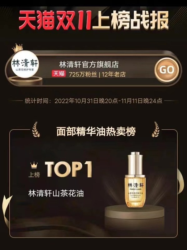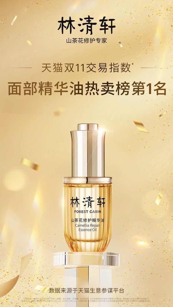 深耕化妆品行业多年,林清轩的系列产品深受消费者好评,此次山茶花修护精华油在天猫双十一活动中获得同类产品销量第一的战绩,更充分说明了市场对于产品品质的认可。正是凭借对用户需求的洞察和产品技术的创新突破,不断探寻让肌肤发光的秘密,让林清轩实现销量突围。如今,林清轩已经在高端护肤品领域站稳脚跟,成为新一代国货的代表性品牌。未来,林清轩将持续为中国的消费者带来更好的护肤产品。