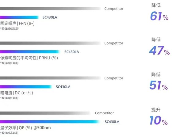 另一方面,凭借思特威创研的超低噪声外围读取电路技术及升级的色彩工艺,SC430LA可实现出色的噪声控制和色彩呈现效果。其固定噪声(FPN)与像素响应的不均匀性(PRNU)分别可降至0.28e-与0.53%,相比业内同类产品,暗电流大幅降低51%,显著提升产品捕获到的图像质量,呈现更高的颜色精准度和更丰富的图像细节,能够充分满足工业应用对高精度传感器的要求。