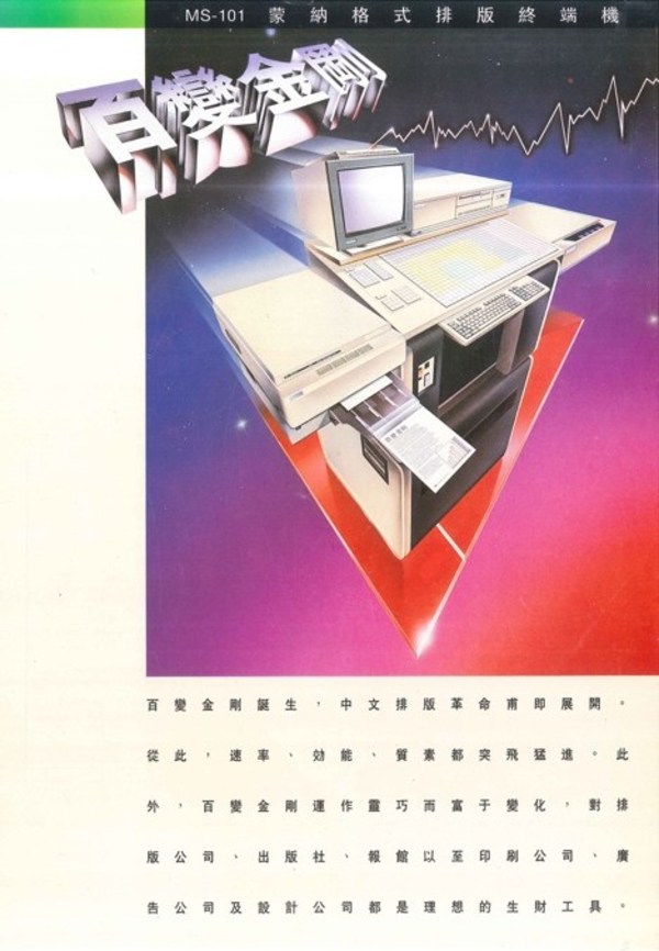 此次展览,蒙纳经典的人文主义字体“翔鹤黑体”,以及为腾讯定制的品牌字体都列入了展品。作为对本次展览主题的呼应,蒙纳还提供了具有历史意义的第一版“蒙纳宋体”数字化版本原始样张,以及诞生于上个世纪八九十年代、具有划时代意义的“MS-101蒙纳格式排版终端机‘百变金刚’”宣传资料。