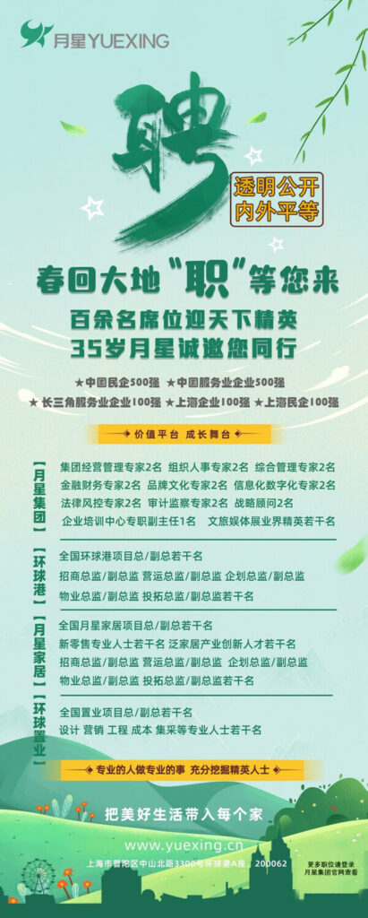 春节前夕,月星集团宣布启动"春回大地,‘职’等您来——月星大招聘"活动,面向公司内外延揽精英人才。本次招聘涉及高级经营决策层、高级运营管理类和部分专业领域的高级人才等共计百余个工作岗位。这是月星集团推进"三个提升"系列举措中的"第一招"。