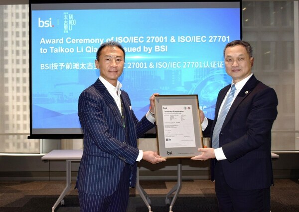 上海2023年1月19日 /新闻稿网 - Xinwengao.com/ — 近日,前滩太古里顺利通过BSI的严格审核,获得ISO/IEC 27001信息安全管理体系和ISO/IEC 27701隐私信息管理体系国际标准认证。前滩太古里总经理卢楚麟、BSI大中华区董事总经理张翼翔等共同出席颁证仪式。