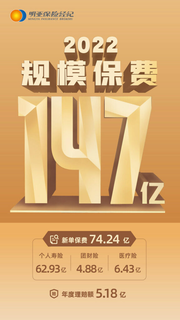 据统计,明亚2022年实现规模保费147亿元,其中新单保费74.24亿元(个人寿险62.93亿元,团财险4.88亿元,医疗险6.43亿元),年度理赔总额5.18亿元。