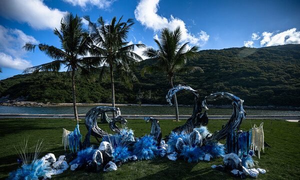 此次发布会打破了传统宴会仅有视觉呈现的体验,将青梅草坪近处的海浪、对岸的远山收录为声音设计的重要素材,空间拓展到整个酒店乃至整个自然生态系统之中。在视觉设计中,发布会大量使用银色、黑色等极具现代风格的色彩,并以木质巨像地构成形如海浪又形如心脏的地面装置,藉由它的弧光反射出天上星辰的颜色。寓意着海是天空的镜子,而每一个孤单的浮木,会因为一簇微小的灯光而相聚,成为一片海,或是变成一座山,恰似青梅草坪中山海相逢的浪漫意境。