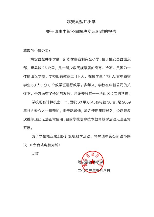 在接到中智股份捐助的电脑后,大姚县金龙明德小学、姚安县盐井小学、姚安县新街社区居民委员会纷纷发来了感谢信。