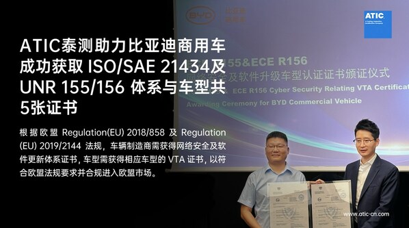广州2023年8月18日 /美通社/ — 根据欧盟Regulation(EU)2018/858及Regulation(EU)2019/2144法规,车辆制造商需要获取R155/R156体系证书,车型需要符合R155/R156车型认证证书,以符合欧盟法规要求并合规进入欧盟市场。截止今日,泰测已成功助力比亚迪获取ISO/SAE 21434证书、UN R155/156体系证书,UN R155/156车型VTA证书共计5张证书。 ATIC泰测助力比亚迪商用车成功获取ISO/SAE 21434及UN R155/156体系与车型共5张证书 UN R155/UN R156法规为了应对汽车数字化、网联化以及自动化发展所带来的网络安全及消费者隐私风险,WP.29制定网络安全UNR 155和软件更新UNR 156法规,将通过为汽车制造商制定明确的性能和审核要求,帮助应对这些风险。欧盟大批量认证对于新车型(new type),从2022年7月起需满足R155/R156法规,对于新车(new registration),从2024年7月起需满足该法规。 关于比亚迪比亚迪公司致力于“用技术创新,满足人们对美好生活的向往”,经过20多年的高速发展,已在全球设立30多个工业园,实现全球六大洲的战略布局,目前汽车产品已出口全球200多个国家与地区。 比亚迪商用车汽车网络安全与软件更新比亚迪商用车携手泰测于一年余前启动汽车网络安全与软件更新项目,期间克服疫情影响,于2022年9月获得ISO/SAE 21434体系证书,之后由泰测专家团队及欧洲团队通过线下和线上相结合的方式开展审核,并于2022年12月完成终审,最终于2023年4月获得UNR 155和UN R156体系证书,证明比亚迪商用车在产品概念、开发、生产、运行、维护、和报废等全生命周期各个阶段都符合了欧盟网络安全及软件更新的法规要求。 在获得UN R155和UN R156体系证书后,比亚迪启动多个车型的VTA认证,由泰测专家进行文件审核、目击测试、报告编写与审核。截止发文,第一款商用车车型已获得UN R155/UN R156车型VTA证书。 比亚迪与泰测颁证仪式现场