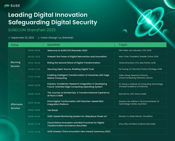 北京2023年8月30日 /新闻稿网 - Xinwengao.com/ — 生成式 AI 浪潮席卷而来,正在引领新一轮的技术变革,为企业数字创新带来无限可能。而在数字创新的另一面,数字信任正成为黄金标准,致力于通过严格的网络安全实践和强大的数据保护措施,为数字创新保驾护航。 SUSE 作为全球范围内创新、可靠且安全的企业级开源解决方案领导者,致力于帮助客户打造更安全的 IT 基础设施,加速其数字化转型和创新。SUSECON 是由 SUSE 主办的面向全球客户、合作伙伴和行业领袖的年度数字创新峰会,9月22日,SUSECON 中国站将在深圳福田香格里拉隆重召开。 Time Topic Speaker Morning Session 09:30-09:35 Welcome to SUSECON Shenzhen 2023 Dirk-Peter van Leeuwen, CEO, SUSE 09:35-10:10 Unleash the Power of Digital Reinvention and Innovation Alan Chan, President, Greater China, SUSE 10:10-10:45 Riding the Second Wave of Digital Transformation Vishal Ghariwal, CTO, Asia Pacific, SUSE 10:45-11:10 Securing Open Source, Building Digital Trust Fei Huang, VP, Securtiy Product Strategy, SUSE 11:10-11:40 Enabling Intelligent Transformation of Industries with Edge Native Computing Yabin Dang, Research Director, Cloud Computing Software, Lenovo Afternoon Session 14:00-14:35 Industry-Academia-Research Integration in Developing Future-oriented Edge Computing Operating System Dr. Dong Li, Institute of Computing Technology, Chinese Academy of Sciences 14:35-15:10 The Journey to DevSecOps: A Transformational Experience at Nova Credit Samuel Ho, CEO, Nova Credit 15:10-15:45 Drive Digital Tranformation with Rancher-based R&D Integration Platform Zhaohui Xie, Paltform Technical Director of Technology Center, Zoomlion 15:45-16:05 Tea Break 16:05-16:40 SUSE-based Monitoring System for Ubiquitous Power IoT Stanley Tu, Sales Diector, CloudSino 16:40-17:15 Cloud Native Innovation and Best Practices for Digital Transformation at Essence Securities Zhou Wei, Architect, Essence Securities 17:15-17:35 SUSE Greater China Innovation Hero Award Ceremony 2023 Agenda 本届峰会以“引领数字创新·护航数字安全”为主题,与专家智囊共同探讨前沿科技潮流与商业观察洞见;与来自制造、零售、金融、物流、出海等领域的客户共同分享业务创新实践和典型应用场景;与行业英才共同探索如何通过“开源”且“开放”的企业级 Linux、企业容器管理、边缘和安全产品,构建多元、安全的数字创新解决方案,探索未来无限可能。 无论您已开启数字化转型之旅,还是刚刚整装待发,SUSECON 深圳 2023都将为您开辟新的视野,充分发掘创新潜能。9月22日,深圳福田香格里拉等你来。欢迎报名:https://hdxu.cn/oxDvX