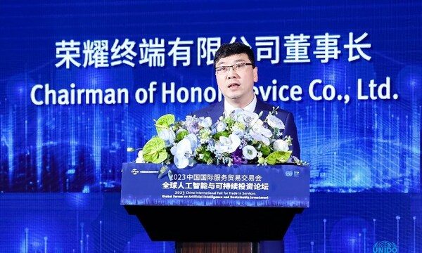 北京2023年9月4日 /新闻稿网 - Xinwengao.com/ — 9月3日,荣耀终端有限公司董事长万飚受邀参加2023年中国国际服务贸易交易会,出席"人工智能与可持续投资"论坛并发表"AI深度赋能,推动可持续投资与发展"的主旨演讲。论坛中,万飚向与会嘉宾分享了人工智能技术如何重塑智能终端行业,从产品、服务、企业内部运营维度,荣耀积极拥抱AI浪潮,并强调荣耀将会坚持开放合作、携手全球伙伴建设AI生态。