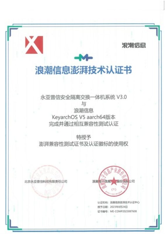 北京2023年9月6日 /新闻稿网 - Xinwengao.com/ — 近日,北京永亚普信科技有限责任公司(简称永亚普信)与浪潮电子信息产业股份有限公司(简称浪潮信息)在产品兼容适配领域获得重要突破,北京永亚普信安全隔离交换一体机系统 V3.0与浪潮信息云峦服务器操作系统KeyarchOS完成浪潮信息澎湃技术认证。认证结果显示,双方产品整体运行稳定,功能、性能表现良好,为用户提供更安全、可靠的信息化环境,满足用户核心需求,进一步推动双方深度合作。 浪潮信息澎湃技术认证是基于自身多元、创新的通用计算平台,与供应链及软件服务等生态合作伙伴共同构建的产品互兼容性认证体系,旨在积极推动从部件到系统软件到行业应用的全产业链共建、共享、共赢,致力打造计算领域覆盖最广、测试严苛、品质卓越的开放认证生态。浪潮信息将通过澎湃技术认证,与生态合作伙伴缔结更紧密的合作关系,在降低客户部署成本和周期的同时,推动产品和解决方案的前向创新,使能各行各业基于浪潮信息通用计算平台加速实现数字化、智慧化转型。 北京永亚普信安全隔离交换一体机系统 V3.0作为"一体化"设计的网络安全隔离设备,保护了用户在跨网跨域数据交互场景下的信息安全,满足用户对安全的核心需求。秉承"数据真落地,格式严检查"理念,系统阻断网络攻击和恶意代码植入,提供给用户专业的检测机构技术鉴定测试报告,并且仅用一台设备即可支持文件摆渡/接口调用/数据库同步/端口映射/对象存储五大应用场景。 永亚普信安全隔离交换一体机系统 V3.0不仅为用户提供超高性能的产品服务,而且更加关注产品易用性,推出了零侵入、热插拔等功能,以满足用户便捷使用需求。同时,永亚普信安全隔离交换一体机系统 V3.0在技术上也加强了护网能力,解决用户护网期间的安全隐患问题。 浪潮信息KeyarchOS始终坚持软硬协同优化核心发展战略,通过与多元计算架构的协同优化,提升基础计算场景的支撑能力。永亚普信安全隔离交换一体机系统 V3.0充分利用KeyarchOS软硬件协同优化能力,大大提升了在协议解析、协议封装及请求还原、文件摆渡、图文转换方面的性能,基于KeyarchOS使得永亚普信安全隔离交换一体机系统 V3.0具备了更好的业务场景支撑能力和极致客户体验。 此次双方产品兼容性互认证的成功,意味着浪潮信息KeyarchOS的生态版图进一步扩大,未来双方将持续为用户提供稳定可靠的产品和服务,携手更多的生态圈伙伴,推动产品生态建设,共筑网络安全防线。