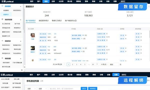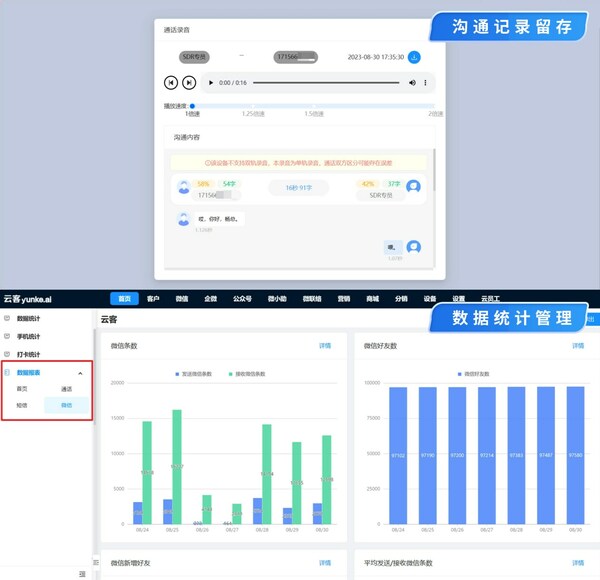 在使用云客工作手机时,无需手动录入信息,工作手机会自动对销售人员的设备、通话、短信、微信、企微、QQ等全方位统一存档与管理,并形成客户时间轴。管理者可以随时查看和监控销售人员的电话通话、短信数据和微信聊天内容,提升销售整体水平和沟通效率。
