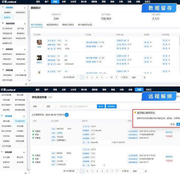 为了规范销售动作,保证服务质量,云客工作手机会对员工的敏感操作进行留痕,如发生删除客户、发红包、拉黑客户、转账等操作,或当销售与客户沟通时,出现辱骂客户,夸大承诺等行为,系统也会进行及时提醒、及时阻断。
