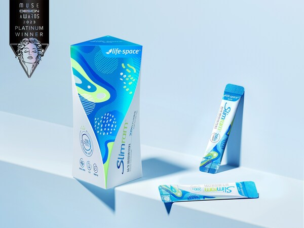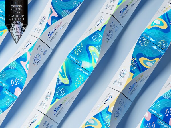 荣获缪斯设计奖最高铂金奖的lifespace益倍适"SlimU小蓝腰益生菌"系列包装将外盒结构结合lifespace logo的叶子造型,模拟出女性腰身曲线,直观传达产品个性。外盒表面以多款形态与色彩不同的随机图案来抽象化表达人体微生态的奇妙变幻,整体风格极具专业感同时不失时尚风格,与市面上益生菌产品普遍采用的规整形状纸盒包装形成差异,很好地吸引年轻消费者青睐。同时,lifespace注重地球可持续发展,获奖系列产品外包装盒均选用可回收的PET环保材料与生产工艺,成为设计一大亮点。