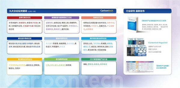 Carbontech 2023论坛共3天,首日将进行全体大会,后两日举行八大平行分论坛,从金刚石、碳纳米材料、碳纤维及碳/碳复合材料、多孔碳材料、储能材料、碳化硅材料等材料角度出发,从全球市场、行业现状、前沿技术、创新产品、政策解读、投融资等多维度讨论行业趋势及创新案例。