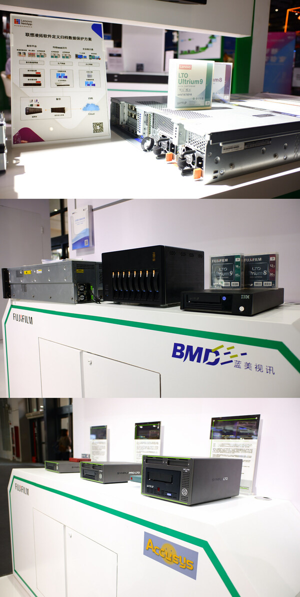 在展台上,富士胶片(中国)还邀请合作伙伴一同向参观者呈现涵盖数据产生、编辑、备份、存储、售后的完整数据存储生态链的磁带存储解决方案。富士胶片(中国)与联想凌拓科技有限公司合作的D2D2T数据保护和冷备方案,通过分层管理助力用户发挥数据价值。蓝美视讯科技有限公司带来LTO磁带机、飞编大师分布式存储技术、广电非编及媒资存储及后期在线制作集中存储解决方案等。北京世仰科技有限公司则专为工作室和影视现场制作构建了一个集成的 LTO 备份和归档产品系列解决方案。通过与合作伙伴的合作,为长期存储领域提供了新的视角从而更好地应对企业和终端用户面临的实际挑战,实现分层管理,降本增效,助力发挥数据价值。