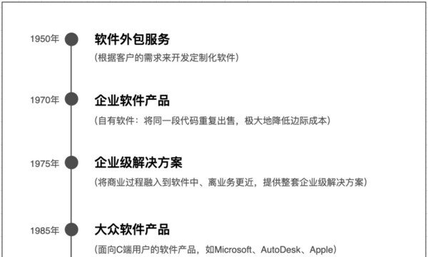 1999年,美国Oracle前高级副总裁马克·贝尼奥夫为了解决传统软件行业又贵又用不起来的痛点,创立Salesforce、推出在线版CRM产品。贝尼奥夫喊出“终结软件(end of software)”的口号,将软件作为服务(Software as a Service,SaaS)销售,在捆绑销售软件的时代杀出了一条生路,最终成长为市值千亿的绝对领先者。 由此,我们现在所说的狭义上的企业级SaaS才正式诞生。