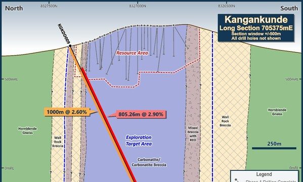 该勘探目标的审议在第二阶段深孔钻探计划成功之后进行,该计划显示了高品位稀土矿化的连续性,最深可达MRE界限以下800米。这些深度延伸钻孔报告的重要截距是: