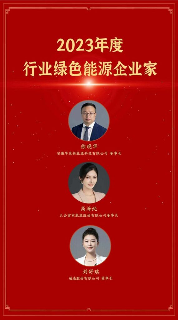 3位新能源企业领军人获得这一奖项,分别是:安徽华晟新能源科技有限公司董事长徐晓华、天合富家能源股份有限公司董事长高海纯、通威股份有限公司董事长刘舒琪。国合洲际能源研究院院长王进为三位企业家代表颁奖。