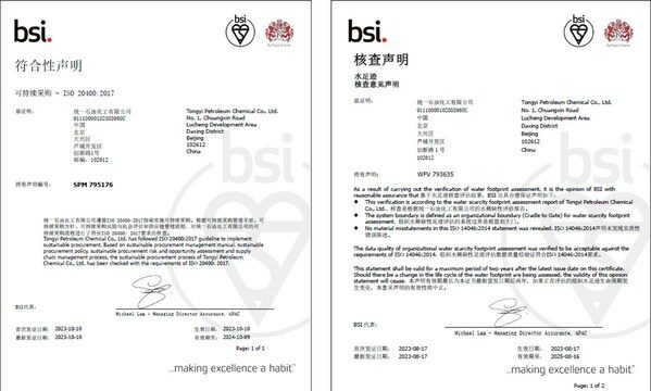 北京2023年11月13日 /新闻稿网 - Xinwengao.com/ — 近日,统一石油化工有限公司顺利通过全球知名认证机构BSI核查,荣获BSI国内首张ISO 20400可持续采购符合性声明;以及水足迹核查意见声明,组织水稀缺性足迹评估数据质量经验证符合ISO 14046:2014要求。