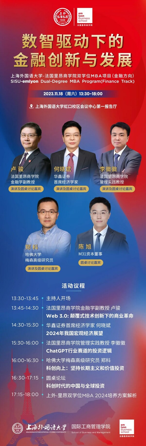 11月18日,上海外国语大学-法国里昂商学院双学位MBA项目 (金融方向) 将举办年度金融论坛,以"数智驱动下的金融创新与发展"为主题,特别邀请了五位来自学术界和商界的嘉宾围绕政策研究、金融科技、投资分析等问题,共同探讨中国金融领域创新与发展方向。