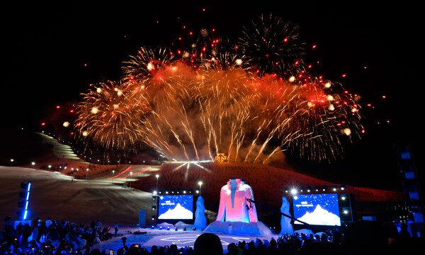 在光影的映衬下,迪桑特品牌代言人陈伟霆先生与迪桑特(中国)有限公司董事长丁少翔先生共同登台,点亮巨型冰雕上代表着滑雪运动中"直滑降"、"斜滑降"以及"横滑降"三种专业技术的迪桑特"三箭头"标志,共同开启了迪桑特滑雪新征途,重申迪桑特"一切始于滑雪"的品牌基因,也寓意着品牌在"人类滑雪起源地"追溯初心、追求卓越的新征途。