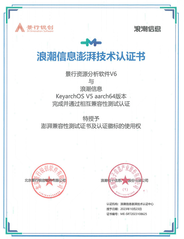 北京2023年11月22日 /新闻稿网 - Xinwengao.com/ — 日前,北京景行锐创软件有限公司(简称景行锐创)与KeyarchOS通过浪潮信息澎湃技术认证,双方兼容性测试,景行安全控制软件V6、景行应用可视化软件V6、景行应用门户软件V6、景行资源分析软件V6、景行资源管理与调度软件V6在KeyarchOS V5平台上运行稳定高效,整体表现良好,满足用户需求。