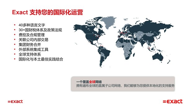Exact易科软件作为本次论坛的出海信息化专家应邀参展,并进行《中企海外分支信息化》主题分享。Exact易科软件是有40年历史的欧洲企业管理软件领导厂商,全球16个国家拥有2000多名员工,125个国家拥有超过400,000的客户,植根中国25年,客户500+家。Exact易科软件中国团队支持中资企业出海。凭借独特的优势,近年来Exact中国团队的顾问远赴非洲、北美,欧洲,东南亚等十多个多国家地区成功地完成爱派克斯物流、山河智能、埃顿集团、杭州锦江集团等多家中资企业海外分支的信息化项目。