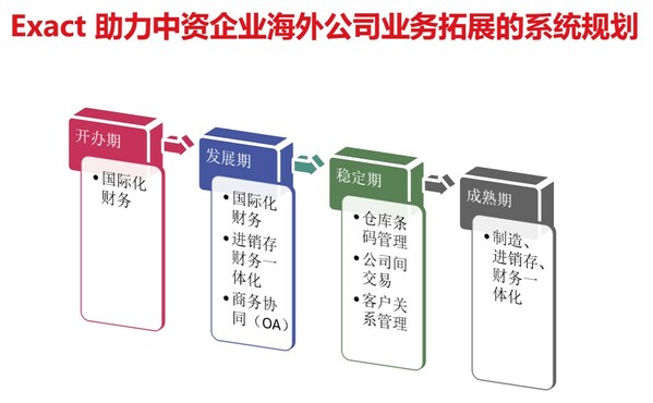 易科软件还针对中资企业海外业务发展的不同阶段度身定制信息化规划,使得出海企业一步一步完善企业的信息化管理。规划体现了出海企业随着业务发展对数字化的阶段性需求,不仅要从"有"到"好",更要从"及格"到"优秀"再到"卓越"。IT能力该如何循序渐进地发展,对于不同的企业而言,或许落地方式各不相同,而"标准化"是一个简单且高效的抓手,满足规模效益及可持续发展的需要。通过制度与流程的标准化,强化本地运作,将价值链分解,在全球范围内按"优"分工,有助于实现资源的最优配置。