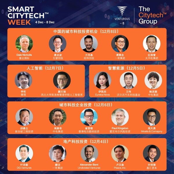 北京2023年11月29日 /新闻稿网 - Xinwengao.com/ — 城市科技 (Citytech™) 集团一奇集团 (Venturous Group) 将于2023年12月4日至8日举办其年度旗舰活动——智慧城市科技周。众多城市科技领域的专家、企业家与投资人齐聚一堂,共同探讨中国和大湾区的发展新态势和机遇。 科技和投资界大咖齐聚一奇智慧城市科技周 自2010年以来,中国政府为突显其对发展数字经济的坚定承诺,已在智慧城市建设投入超2万亿美元。据中国信息通信研究院的数据显示,这项投资仍在持续增长,预计到2023年底将超过4万亿美元,届时中国将成为世界上对智慧城市领域投资最大的国家。 针对这一势头,一奇集团将在2023年智慧城市科技周邀请城市科技领域知名的投资人、行业专家与企业家,共同探讨城市科技的技术演进、城市科技的商业化以及中国和大湾区的投资机会。 在本次活动上发表演讲的部分业内大咖包括富达国际 (Fidelity International) 基金经理Dale Nicholls先生;戈壁创投 (Gobi Partners) 管理合伙人唐啟波先生;经纬创投 (Matrix Partners China) 合伙人万浩基先生;一奇集团创始人兼首席执行官谭秉忠先生;新加坡工程投资公司 (ST Engineering Ventures) 主管邱鼎立先生;中电集团 (CLP Group) 风险投资与研究主管周展奇先生;沃尔沃汽车科技基金 (Volvo Cars Tech Fund) 投资总监王伟先生;凯洛格管理学院 (Kellogg School of Management) 人工智能顾问蒯文瑞先生;基汇资本 (Gaw Capital ) 高级总监许培德先生;慧搭 (WeStyle Inc.) 创始人兼董事长李松博士;天津安捷物联 (Tianjin Anjie IoT) 首席技术官兼首席战略官金亚东先生。 一奇集团联合创始人兼首席商务官利宇汉先生表示:"我们很高兴连续四年举办智慧城市科技周。对热衷于中国城市科技的人来说,该活动是一个绝佳了解城市科技领域投资人、企业家与技术专家洞见的机会。" 活动分为五场,每场包括主题演讲和/或小组讨论。所有场次将在Zoom和微信视频号进行直播并支持英语和普通话同声传译。 人工智能:一个全新的领域 — 解读最新流行语,从发现商业化机会到日益引起重视的伦理问题、采用率等等。 中国的城市科技投资机会:下一个风口在哪?— 对投资中国市场有丰富经验的投资人将告诉您,为何在紧张的政治局势与无法预测的政策风向变化下,他们始终没有失去信心,以及如何准确把握各类投资机会。 地产科技投资:革命悄然进行 — 房地产投资人和企业家将揭示了新时代下地产科技投资的方向与机会,包括在促进环境可持续性方面发挥的作用。 城市科技产业投资:该拥抱战略还是技术?— 在更具挑战的融资环境下,许多公司开始寻求CVC(产业投资方)的投资。您将了解CVC与传统风险投资和私募股权的不同之处,以及为什么CVC将是某些科技公司的更好选择。 智慧能源:赋能变革,启迪未来 — 从智慧能源解决方案投资商、服务提供商、和客户的角度,了解中国如何通过智慧能源技术实现碳中和目标。 立即注册即可免费实时观看访谈或在活动后观看2023智慧城市科技周的精彩回放:https://www.venturousgroup.com/events/smart-citytech-week-2023/。