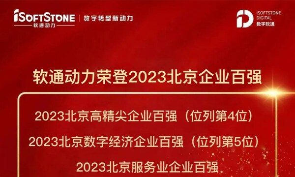 北京2023年12月4日 /新闻稿网 - Xinwengao.com/ — 11月30日,中国企业联合会、北京企业联合会等共同发布了"2023北京企业百强"榜单。凭借在数字化、智能化服务上的卓越实力,软通动力荣登"2023北京企业百强",并上榜 "2023北京高精尖企业百强"(位列第4位)、"2023北京数字经济企业百强"(位列第5位)、"2023北京服务业企业百强"、"2023北京上市公司百强"4个细分百强榜单。这充分显示了业界对软通动力经营实力和社会贡献的高度认可。