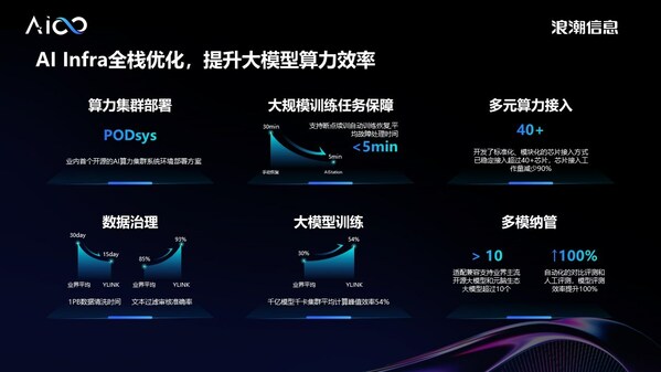 为加速模型生产和落地应用,浪潮信息在AI Infra层面开发了大模型智算软件栈OGAI (Open GenAI Infra)。在算力部署方面,OGAI开源了业界首个AI算力集群系统环境部署方案PODsys;在大规模训练的长时保障方面,从算力调度平台层实现了自动化断点续训;在多元算力接入方面以标准化、模块化接入方式稳定接入超过40+芯片;在数据治理方面构建了流程化、可自定义的数据清洗pipeline,有效缩短数据清洗时间、提升文本审核过滤准确率;在计算效率优化方面,通过对分布式并行算法的极致优化,将千亿参数模型的训练计算效率提升到54%;在多模型管理方面已经支持了超过10个业界主流的开源大模型和元脑生态大模型,用实践证明AI Infra全栈基础软件和工作流的创新是多元算力高效释放、提升大模型算力效率的关键。