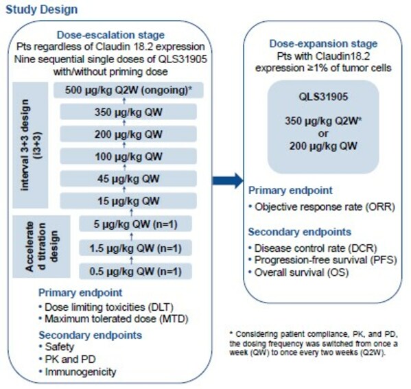 Claudin18.2是具有高度特异性的细胞表面分子,其异常激活表达常见于原发性胃癌以及胰腺癌、食管癌等实体瘤[1],[2]。QLS31905与肿瘤细胞表面的Claudin18.2和T细胞表面的CD3结合,通过募集和激活肿瘤细胞附近的T细胞,对肿瘤细胞进行持续地杀伤裂解。本研究纳入标准治疗失败或不适用或无标准治疗的晚期实体瘤患者。研究分为剂量递增和剂量拓展两个阶段。剂量递增阶段采用加速滴定和i3+3的研究设计,QLS31905单次给药剂量按照0.5μg/kg QW、1.5μg/kg QW、5μg/kg QW、15μg/kg QW、45μg/kg QW、100μg/kg QW、200μg/kg QW、350μg/kg QW、500 μg/kg Q2W递增,主要终点是剂量限制毒性(DLT)和最大耐受剂量(MTD),次要终点是安全性、药代动力学和药效动力学、免疫原性。剂量拓展阶段的主要终点是客观缓解率(ORR),次要终点是疾病控制率(DCR)、无进展生存期(PFS)、总体生存期(OS)。