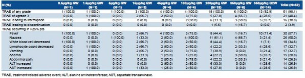 安全性方面,DLT未发生,尚未确定MTD。共计21例(40.4%)受试者发生了≥3级的治疗相关不良事件(TRAE)。10例(19.2%)受试者发生了治疗相关的严重不良事件。2例受试者(3.8%)发生了导致停止治疗的TRAE。最常见的TRAE是发热(30例,57.7%)、恶心(26例,50.0%)、白细胞计数降低(18例,34.6%)。350 μg/kg QW队列中的2例患者发生3级及以上的细胞因子释放综合征。