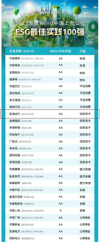 北京2023年12月8日 /新闻稿网 - Xinwengao.com/ — 12月4日,Wind发布了“2023年度Wind中国上市公司ESG最佳实践100强”榜单。软通动力(301236.SZ)凭借在环境保护、社会责任、公司治理等方面的领先实践和卓越表现,以ESG评级AA级、信息技术服务行业排名第一,成功上榜。