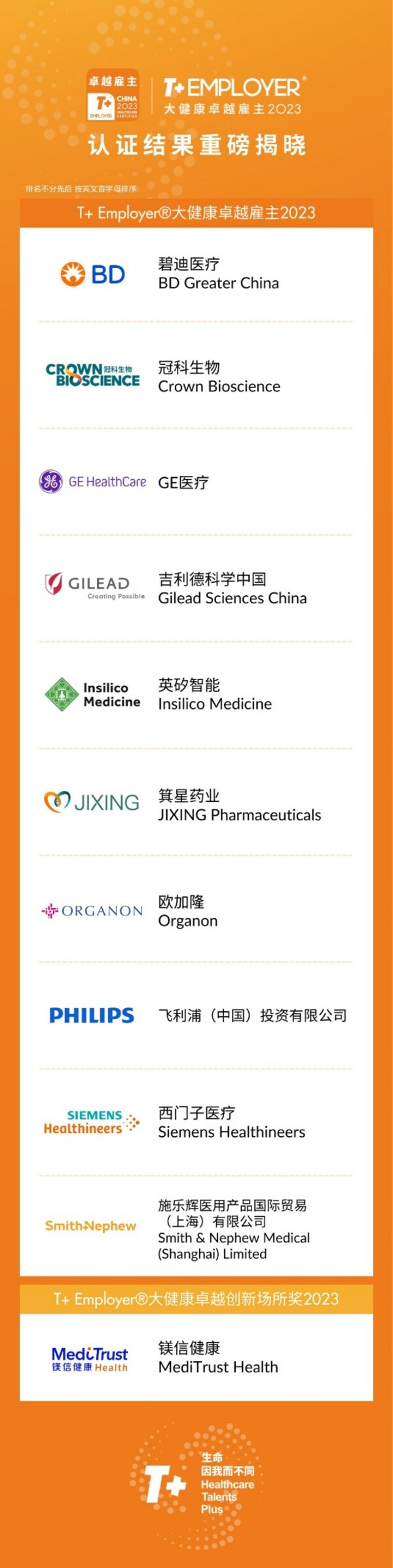 跨越制药、医疗器械、生命科学、科技医疗、消费医疗等大健康细分领域;历经十多个月从入围到结果公布,10家行业领军企业被认证为"T+ Employer®大健康卓越雇主2023",1家企业被评选为"T+ Employer®大健康卓越创新场所奖2023"。