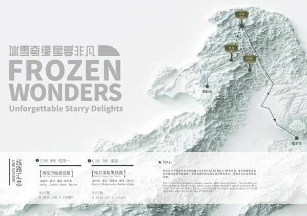 金典有机•呼伦贝尔号全新冬季运营季推出了【海拉尔始发】和【哈尔滨始发】两条6天5晚的线路,途径海拉尔、根河、阿里河、漠河、哈尔滨等城市。