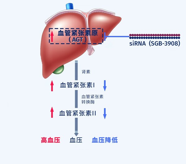 AGT是肾素-血管紧张素-醛固酮系统(RAAS)的最上游前体,该靶点在血压(BP)调节中的作用已得到证实,抑制AGT具有公认的抗高血压效果。SGB-3908可抑制 AGT 在肝脏中的合成,从而可能导致 AGT 蛋白的持久减少,进一步导致血管收缩素 (Ang) II 的减少,最终起到舒张血管、降低血压的效果。