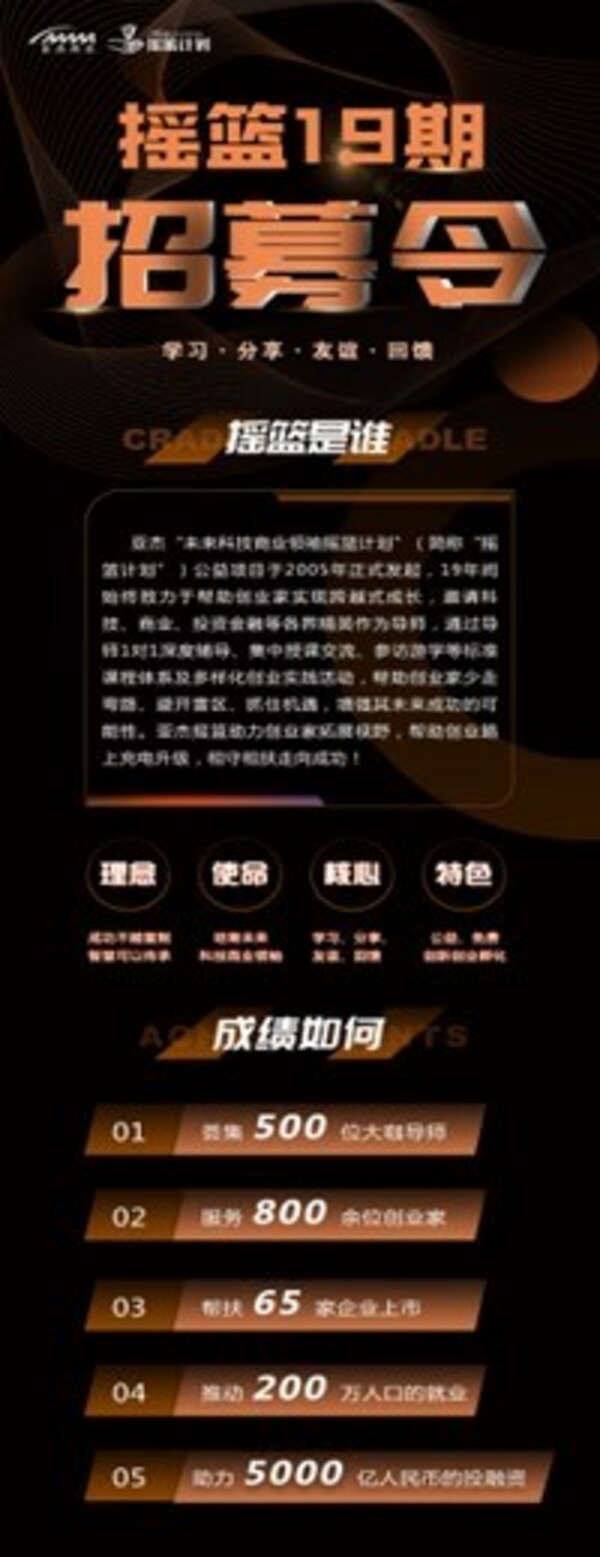 北京2023年12月28日 /新闻稿网 - Xinwengao.com/ — 近日,亚杰摇篮计划19期招募启动,招募截止日期为2024年三月末。2006年,亚杰正式推出"未来科技商业领袖摇篮计划"。"摇篮计划"是一项推动中国青年创业家成长与进步的公益、免费、创新创业孵化项目。摇篮计划以"培育未来科技商业领袖"为宗旨,以"成功不能复制,智慧可以传承"的理念,成为中国举办时间最长,也最为成功的公益孵化平台。 目前,摇篮计划已荟聚了500位大咖导师、800余位创业家,已有65家企业上市,培育出了一大批领军人才,包括兆易创新董事长朱一明、美团创始人/CEO王兴、海兰信董事长申万秋、拼多多创始人黄峥等。 2023年,摇篮计划更是迎来重磅升级,亚杰丰富、优化、升级了生命健康,半导体,智能云三大赛道。在坚持公益属性下多维协作,以多方共赢的宗旨,向符合国家战略发展需求,具有硬科技属性和广泛社会与经济效益的创新型企业提供全方位、全链条的成长扶植。 梳理发现,加入摇篮计划后,创业者将获得以下五个方面的培育孵化。 1、干货满满的创业课程 2年,14课时的系统辅导,业内独创有标准、成体系、实战化的创业课程,例如商战感悟、实操经验、团队搭建、财税管理等纯正干货,帮助创业者少走弯路,助力创业者实现高质量成长。 2、重量级摇篮导师 摇篮计划每年邀请10余位科技、商业、投资金融界的精英作为导师,以深度辅导、培训、讲座和集体活动等多种方式,一对一精准点拨,手把手教你创业路上如何"升级打怪",帮助创业者实现跨越式成长。 3、参访龙头企业 探寻成功之道 通过走进龙头企业,促进大中小企业融通,帮助学员企业找订单、找产能、找供应链,深度交流,充分赋能,助力企业实现跨越式成长。为年轻创业家创造与龙头企业交流、分享、建立友谊的机会,打造出新型的网络化学习型组织。 4、王牌对王牌 扩大创业朋友圈 亚杰本着开放共赢,共享共生的理念,与产业园区、高校院所、各地政府、投资机构、媒体等保持良好合作,旨在专业领域能集合更多优质企业和资源,促进科技成果转化,扩展融资渠道,加强宣传推广,帮助创业者链接更多资源、人脉,收获知识、友情和商机。 5、志同道合的创业同窗 在摇篮,创业者将遇到一群志同道合的创业家,他们经过层层甄选,从众多创业家中脱颖而出,潜力无限,将与新加入的摇篮计划学员携手同行,一起追梦。 更多惊喜,等你解锁 摇篮计划每年通过多种渠道,在上千名申请者中,通过4轮筛选和面试,甄选出20余位富有潜力的创业家入选当期摇篮计划,摇篮计划的通过率仅为3%。 摇篮计划发展目标是在未来10年,为中国培养出10位具备世界影响力的创业家,因此在所有入学审核指标中,财富、规模都不是核心,而是创业家的素质和成长潜力! 摇篮计划的招募条件主要包括:1.年龄在25到40岁之间,创业公司的CEO或创始人;2.申请人有相当的发展潜力,其创业企业有着清晰的商业模式、巨大的市场空间、独特的竞争优势、有机会成为其所在领域的领军企业;3.创业者认同亚杰"摇篮计划"的使命和价值观,并乐于投入时间与精力参与组织活动;4.有意愿与导师就创业相关的管理和发展问题进行长期深入交流和互动,而非寻求单纯的实务帮助;5.申请人所领导的企业处于初创期和成长期。