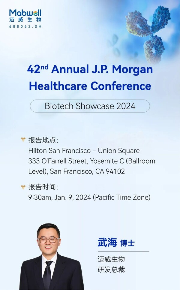 上海2024年1月2日 /新闻稿网 - Xinwengao.com/ — 迈威生物 (688062.SH),一家全产业链布局的创新型生物制药公司,宣布公司研发总裁武海博士将参加美国旧金山举办的第 42 届摩根大通医疗健康年会,并在同期举办的 Biotech Showcase 中,针对迈威生物的全球合作战略,肿瘤、自身免疫及中枢神经系统等领域创新药物管线,以及 IDDC™ ADC 创新技术平台等内容发表演讲。随行研发及商务拓展团队将与全球跨国药企、生物科技公司进行深入交流与探讨,加快拓展全球合作伙伴的步伐。