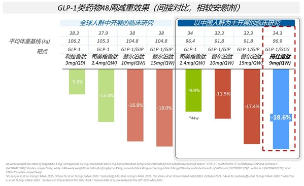 此前,在一项BMI≥30 kg/m2的中国肥胖受试者中开展的II期研究(NCT04904913)中显示,在给药48周后,玛仕度肽9 mg组体重降幅相较安慰剂组的差值达−18.6%;玛仕度肽还显著降低受试者腰围、血脂、血压、血尿酸、转氨酶和肝脏脂肪含量等;耐受性和安全性良好,安全性特征与其他GLP-1受体激动剂类药物相似。