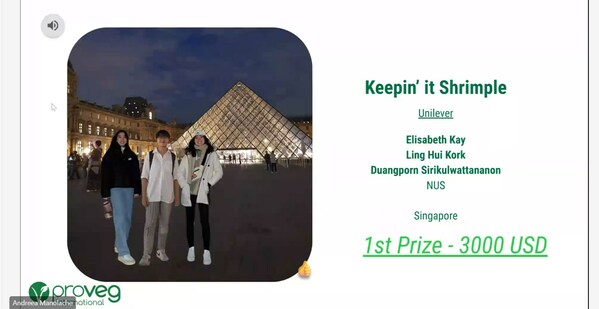 获得最高奖金3000美元的队伍"Keepin’ it Shrimple"来自新加坡,队员们均就读于新加坡国立大学。该队伍为植卓肉匠(The Vegetarian Butcher)设计了一款植物基虾的产品,旨在解决由于过度捕捞而即将面临的海鲜短缺问题。该产品提案凭借其无过敏源的特点,给评委留下深刻印象,并一举夺冠。尽管目前全球植物基虾市场规模达到12亿美元,但是仍然无无过敏源的产品。