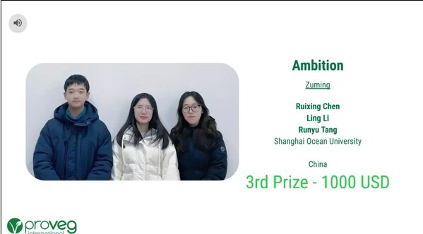 - 来自中国的上海海洋大学的团队"Ambition",该队伍为祖名公司开发了植物沙拉酱。