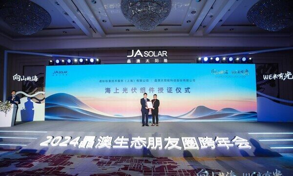 北京2024年1月8日 /新闻稿网 - Xinwengao.com/ — 2024年1月6日,国际公认的测试、检验和认证机构SGS与晶澳太阳能科技股份有限公司(以下简称:晶澳科技)在北京成功举办海上光伏组件性能认证颁证仪式。SGS可再生能源产品线中国区经理周全、晶澳科技产品技术部总监张军博士及双方重要嘉宾出席了本次仪式。